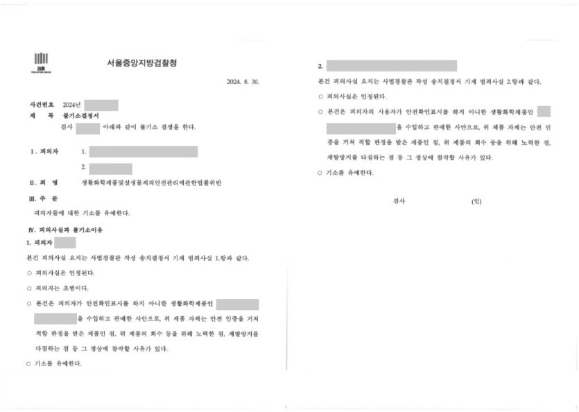 이후 진앤리는 수사기관 피의자신문을 하는 과정에 동석하여 적확한 조력을 제공하였고, 위반의 경위, 환경청 지적 이후의 대응 경과 등을 비롯한 양형사유들을 적극 주장하였습니다. 해당 사건은 서울중앙지검 중요경제범죄조사팀으로 송치되었고, 위와 같은 진앤리의 주장을 면밀히 검토하여 검사는 D사 및 임직원 P에 대하여 화학제품안전법 위반에 관하여 모두 기소유예 처분을 하였습니다.