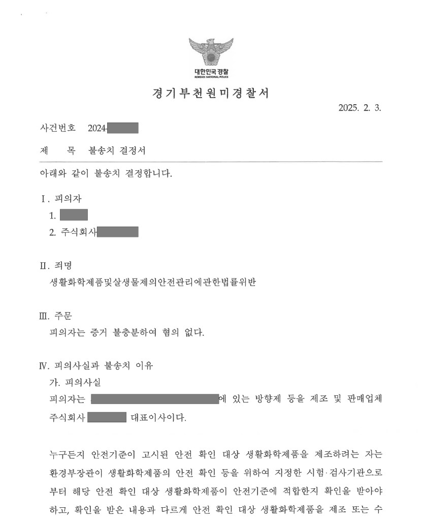 화학제품안전법 위반으로 고발된 유명 화장품 유통업체 및 대표를 변호하여 불송치(혐의없음)을 이끌어낸 사례