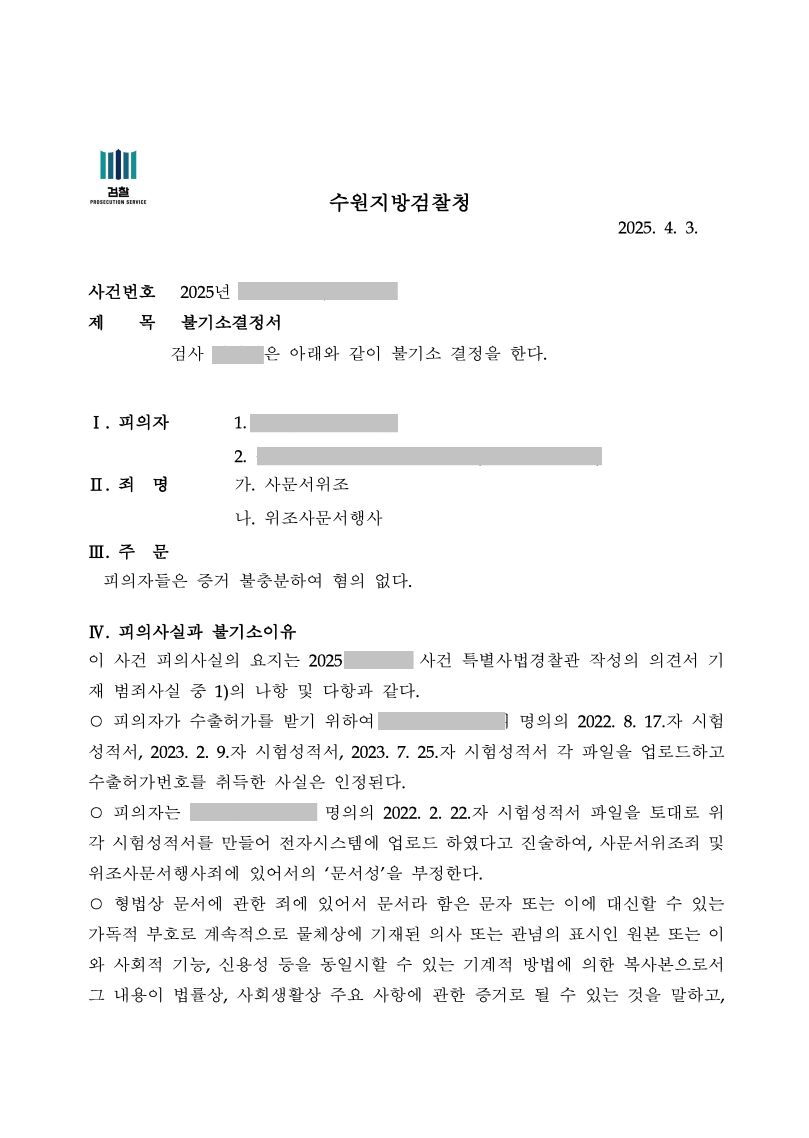 진앤리 법률사무소(담당변호사 : 진실, 고윤아, 송주안, 주가영)는 주식회사 명의의 시험성적서 파일을 토대로 컴퓨터로 위조한 시험성적서를 만든 후 이를 전자시스템에 업로드하였다는 혐의로 수사를 받고 수사를 받고 있었습니다.
