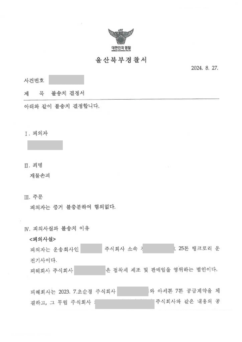 진앤리 법률사무소(담당변호사 : 진실, 정재희 변호사)는 화학물질 오주입으로 인한 재물손괴 혐의로 고소된 운송기사 의뢰인의 변호를 받아, 경찰단계에서 불송치 처분을 이끌어 내었습니다.