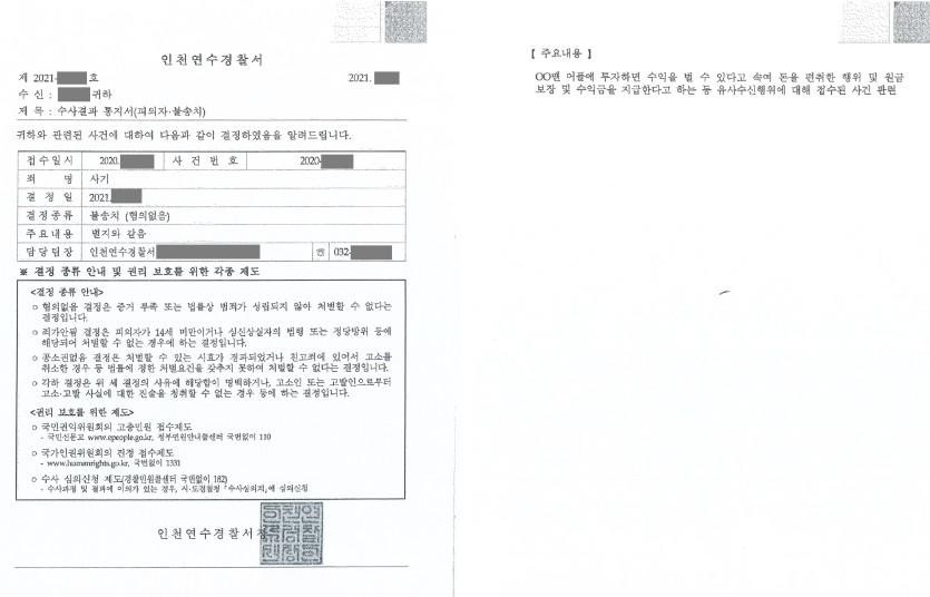 수사대응 유사수신행위 사기로 고소된 피의자 변호하여 불송치(혐의없음) 결정 2025-05-13 진앤리 법률사무소는 어플투자를 통한 원금보장 및 수익금 지급 약속 등 유사수신행위로 인해 사기 혐의로 고소를 당한 피의자를 변호하여 불송치(혐의없음) 결정을 이끌어냈습니다. 검색 목록