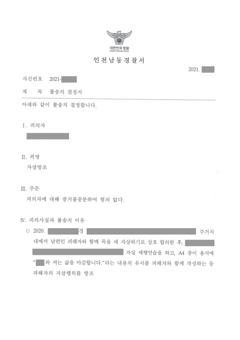 수사대응 자살방조죄 혐의에 대해 증거불충분 불송치결정을 이끌어낸 사안 2025-05-13 진앤리 법률사무소는 자살방조 혐의로 고발된 피의자를 변호하여 증거불충분 불송치결정을 이끌어냈습니다.유가족 진술, 현장 일지 등을 토대로 사실관계를 면밀히 분석하고 피의자가 비록 자살현장에 함께 있긴 하였으나 피해자의 자살을 예측하지 못해 자살방조의 고의가 없었음을 집중적으로 주장하였는바, 경찰서는 위와 같은 주장을 받아들여 증거불충분을 이유로 불송치 결정을 하였습니다. 검색 목록