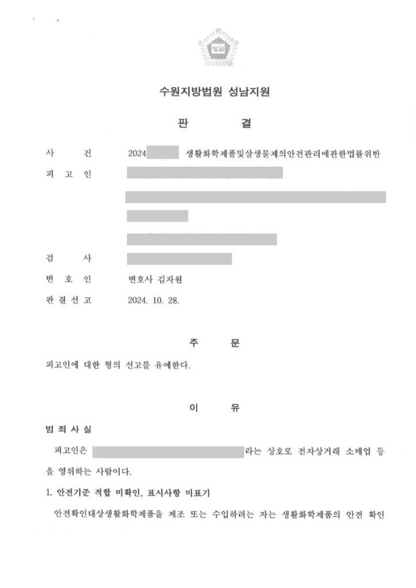 진앤리 법률사무소(담당변호사: 고윤아, 김자원 변호사)는 화학제품안전법 위반으로 약식명령 벌금이 부과된 K씨를 대리하여 정식재판을 청구하여 선고유예를 이끌어내는 데 성공하였습니다.