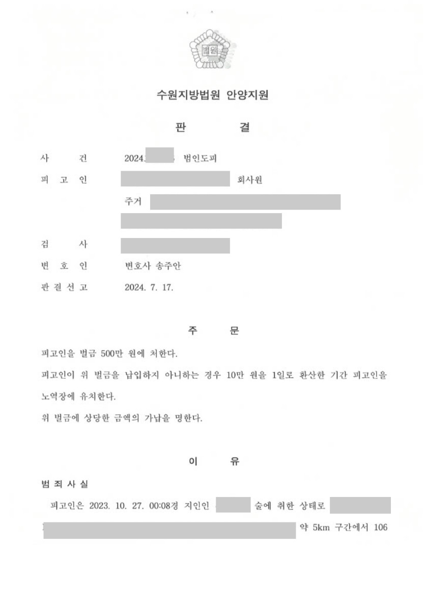 진앤리 법률사무소(담당변호사 : 진실, 송주안, 박초은)는 범인도피(음주운전자)의 피고인을 변호하여 소액의 벌금형으로 방어하였습니다.