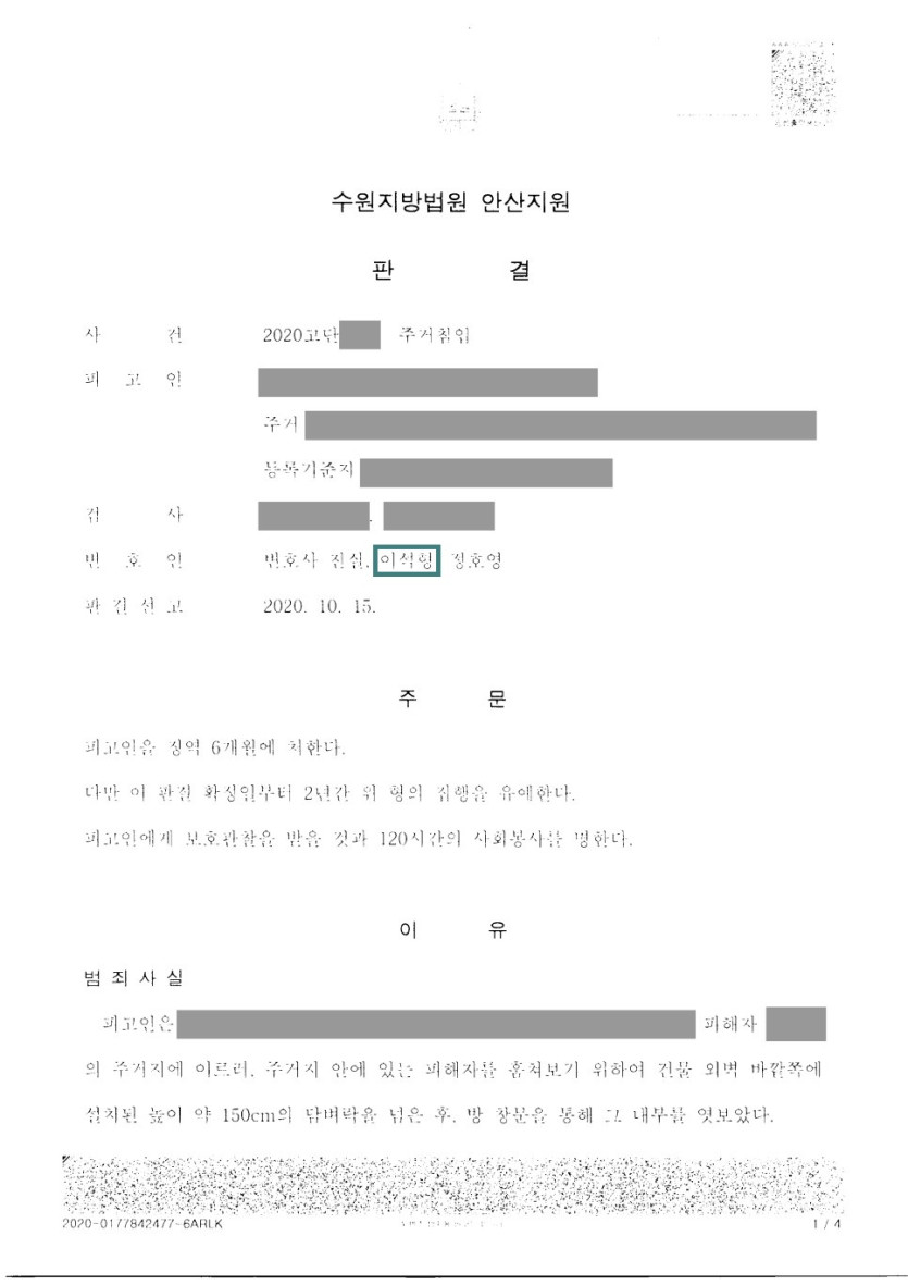 본건의 경우, 각종 언론에 보도되어 이목지 집중된 사건이었을 뿐만 아니라, 동종전과가 있는 피고인이 야간에 담벼락을 넘어 주거침입을 하였다는 측면에서 일반적인 주거침입 사건과 달리 피고인에게 실형 선고의 위험이 높은 사건이었습니다. 다만, 언론에 보도된 부분과는 다르게 사실관계가 상당히 부풀려진 부분이 있었는바, 이석형 변호사는 피고인의 억울함을 해소하기 위하여 단순 양형참작 주장을 넘어 사건 전반에 대해 오해를 바로잡기 위해 검사로 하여금 공소장을 수정하게하는 방식 등으로 변론을 진행하였고 이에 집행유예판결이 선고되었습니다.