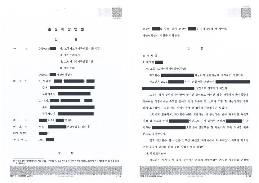 그럼에도 불구하고 피고인들은 피해자에게 사과하기는 커녕 부당한 압력을 주었는바, 진앤리는 피해자를 대리하여 교특법위반(치상) 외 다른 죄들에 대해서도 수사기관이 면밀히 밝힐 수 있도록 하였고 이에 재판부는 피고인들에게 각 징역 1년, 징역 8개월의 실형을 선고하였습니다.