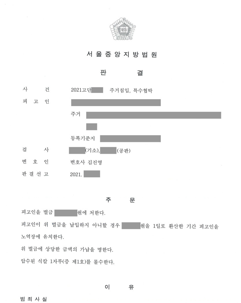 형사사건 특수협박 및 주거침입 혐의로 기소된 피고인, 실형을 면하게 된 사안 2025-05-13 피고인은 야간에 피해자의 방에 침입하고 식칼을 들고 협박하는 등의 혐의로 고소를 당하자, 실형 선고가 예상되어 실력있는 변호사를 찾던 중 진앤리를 찾아와 사건을 의뢰하였습니다.피고인의 주거침입 등 잘못은 인정하나, 사실관계가 과장된 부분을 바로잡음과 동시에 피고인과 피해자의 관계 등을 법원에 설명하였고,이에 법원은 피고인에게 징역형이 아닌 벌금형을 선고하였습니다. 검색 목록