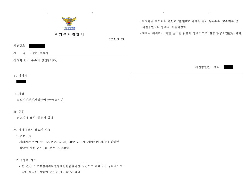진앤리 법률사무소(담당 변호사: 진실)는 스토킹범죄의처벌등에관한법률위반으로 고소당한 P를 변호하여 수사에 대응하고 고소인과의 소통을 담당하는 등 전반적인 조력을 제공하였습니다. 특히 고소인이 오해하고 있는 사실관계에 대해 해명함과 동시에, P의 입장에서 경제활동을 할 수 있도록 P와 고소인 사이에서 합의를 이끌어냄으로써, 결과적으로 고소인은 고소를 취하하였고 이에 따라 검찰 수사까지 가지 않고 P에 대해 불송치 결정이 내려질 수 있도록 하였습니다.